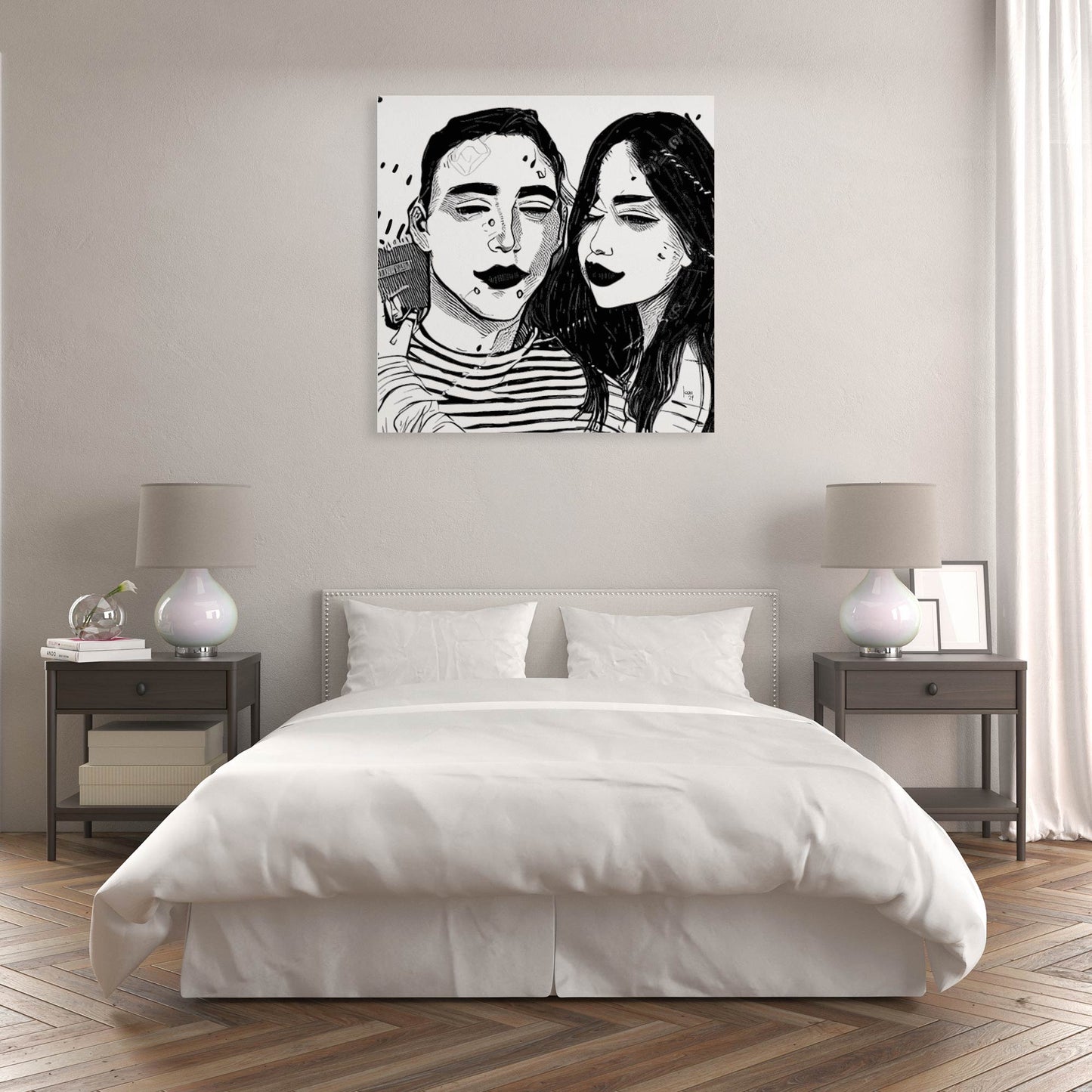 Un portrait en noir et blanc d’un couple, entre intensité et douceur, capturant la complicité silencieuse de deux âmes liées. Minimaliste mais expressif, ce tableau s’impose comme une pièce unique, élégante et intemporelle, parfaite pour habiller un intérieur moderne. Chaque détail, chaque trait exprime une émotion brute, offrant une présence forte à la décoration murale. Création 2024.